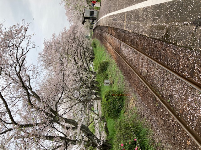 が続き、まさに桜のトンネルの中 に駅があり、満開の中、桜吹雪の中を、ロ